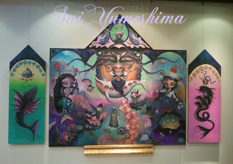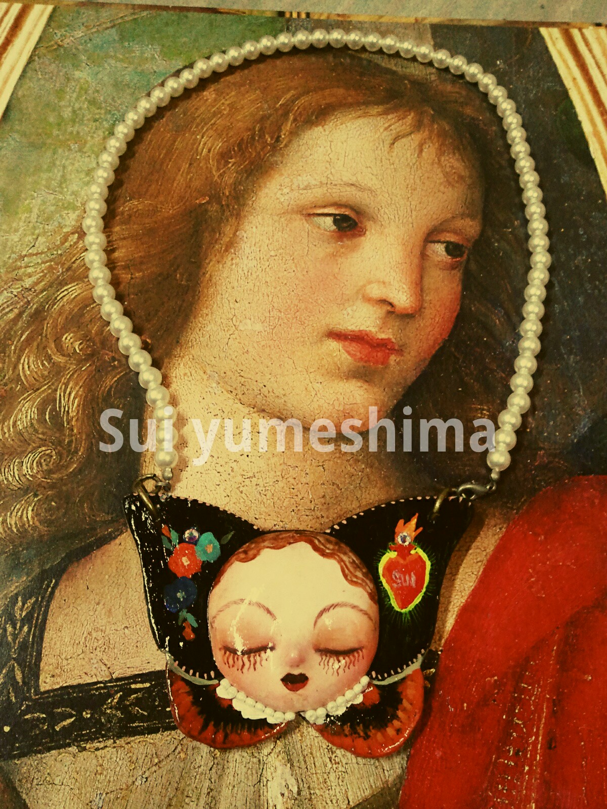 本当に日記をかくネタはあったのですが、最近は日常でやらねばならぬことがあり・・・ なんて ブツブツ言い訳はおいといて、・・・ 今日は 武蔵野美術大学の選抜卒業展示と、多摩美術大学の有志卒業展示、 それに加えて宇野あきらさんの展示を 北見隆先生に連れて行っていただきました。 北見隆先生とは、本当に大学はいっての師匠であり、高田美苗先生と同時に特にお世話になっております。 まず、ムサビ、タマビの卒業展示をみておもったことは、 大人っぽい(といったらあたりまえなのですが) なぁ といった感想でした。 とっても稚拙な第一印象なのですが、去年も 自分と同世代の方々の作品とはおもえないほど 自分とくらべ、テーマややりたいことが一環して 技術等もしっかりしていること、 第三者に伝える ということが明確に表現されていることにいつも感銘をうけています。 キャプションは 自己満足だけで自分が創った作品がおわらないようにするのに大切なもの、 わかるでしょ? かんじてよ。 という作品よりもやはりはるかに説得力 それに感情移入ができます。 100%感情移入ができるというわけではありませんが 感覚を作者に近づけることができる媒体です。 多くをかたりすぎず、結論をだしすぎず、 見てもらう相手にも考える余白を残すキャプションだと尚 ひきたつのかもしれません。 そんなふうに キャプションやコンセプトについて、今一度自分の作品と向き合う切欠となる機会でした。 そのあとは、「君がすきそうな店があるよ~」という北見先生の紹介(顔がとても広いこと!)で 多摩川にある 「マチルド インザ ギャレット」にお邪魔しました。 オーナーの方が睦まじく夫婦でやっていて、イギリスをめぐりめぐって集めた数々のアンティーク、 クリスチャン向けのグッズ等がうってある素敵なお店です。 オーナー家族は敬虔なカトリック教徒さんで、素敵なお話を数々きかせていただきました。 (小さい頃はプロテスタント式に神様をあがめていましたが、私は敬虔なクリスチャンというわけではないです) アンティーク紹介の話でも、とくに、 普段はあまり公開してないような、聖者の遺物等(骨や体に触れた布) みせてもらいましたが、 聖カタリナの遺物もみせてもらえたので 頭がよくなるようにおねがいをしました(努力せい) *聖人・聖カタリナは今日では勉強の守護聖人のイメージ ほかにも 聖テレーズの体にふれた布だとか もろもろ、 ランプ等はほしいものだらけ・・・ とても素敵な空間でした。 そして 北見先生の手がけたジャケットのCDを指差し 北見先生がひとこと 「これ おっちゃんの絵やで~」 にわらいました。 作家も集う場所らしいので、 偶然いあわせた アートプロダクションのかたや 写真家さんとも お話ができるいい機会でした。 自分はというと最近、自分の絵に(毎日といっても過言ではないのですが)迷走していまして、 油絵でリアルに好きなものをかけば 他のアーティストをかけあいに感想をいってもらったりして、 (~っていうアーティスト好き? などなど) 自分じゃない「誰かほかの人」 のわくからとびでたい と常々思っています。 本気で作品をつくる人間は 誰しも自分だけの永久欠番がほしいわけで日々格闘しているんではないかと 最近そのことばかり考えています。 世界ひろし、 雰囲気だけでは 絵のジャンルからはとびでれないのだなぁ・・・と。 かといって、 油絵などを使用して スーパーフラット(平面的)な表現がしたいかというとそうでもなく・・・ しかし ポスター的な明快な絵も大好きです。 と、 いろいろ自分の好き!や やりたい! が邪魔をして、 売れる・売れない では 創りたいものがコントロールできません。 ずるずると上記いってきましたが、 北見先生もおっしゃるとおりに考えると、やはり 自分の本当にやりたいこと、 かきたいものを描いてる人が 一番強いという結論にいつも到達するのですが、 感想をいただいたときに とっても一部ではありますが、 私の心の地雷を踏んでゆくのです。 それはわるいことではなく、 むしろ光栄におもうことなのですが・・・。 と、まぁ ネットで多くを語るのは 自分が未熟な証拠、「のびしろ」 として考えるとします。 けつろんは いつも おなじ・・・ 絵以外では 最近、厚めのベニヤを糸鋸できる作業から、 石膏で顔のパーツをつくってネックレス等をつくることに こっています(笑) 長女:純潔の祈り 次女:いにしえの魔術 こんなかんじです☆ タッセルをアンティーク調にそめたり、 たのしいことばかりです。 今 三女をつくっている途中なのですが、 大量まではつくりませんが、 量産できたら ネット販売したいなぁと 試行錯誤中です(笑) アート作品をみにつける、 という点で 感動できるアクセサリーを! ベニヤはまだまだきって やすり・ニスをぬってあるやつがあるので、 また ちねちね制作したら ブログにでものっけたいです(めんどくさがらずにね!) そして、私の卒業制作もひと段落